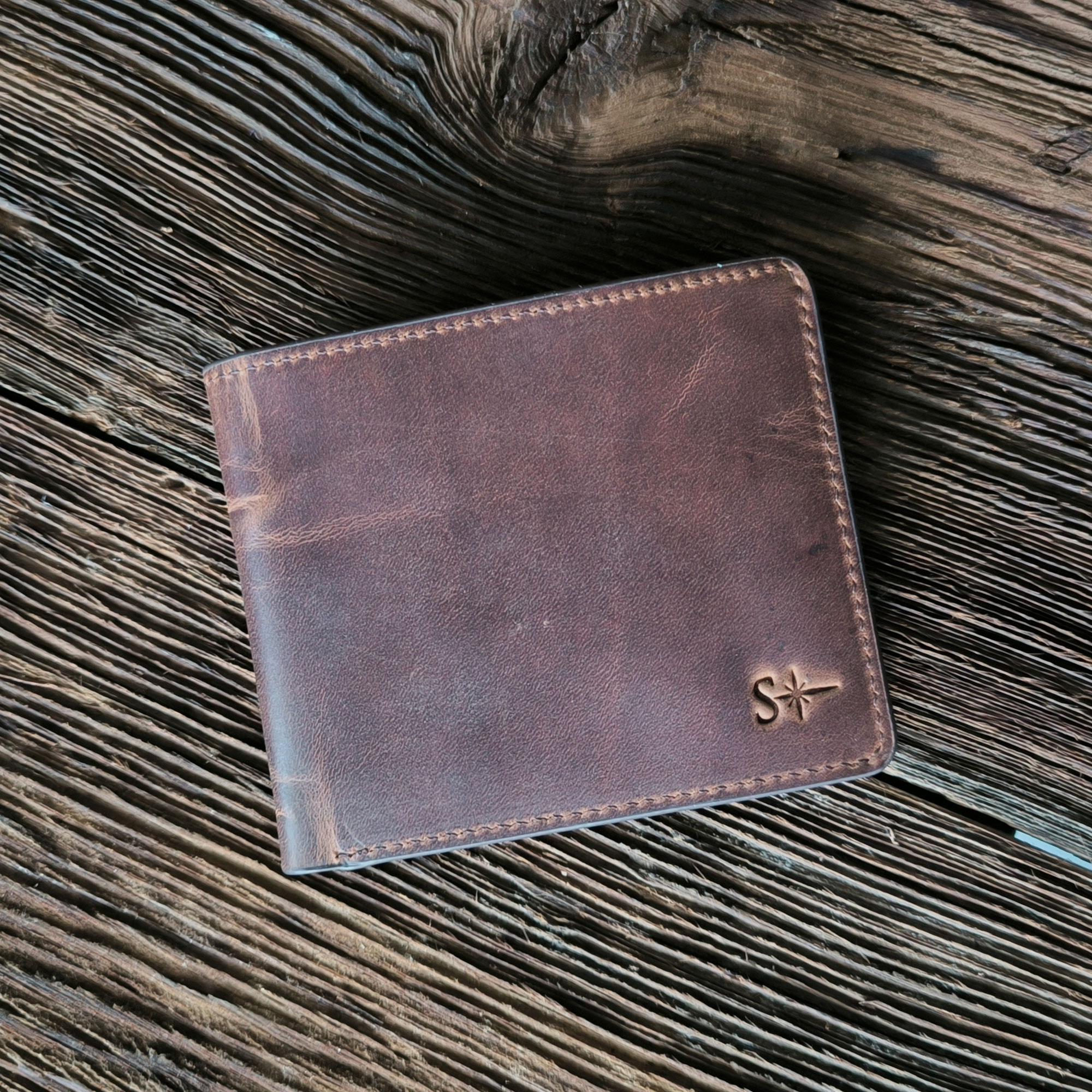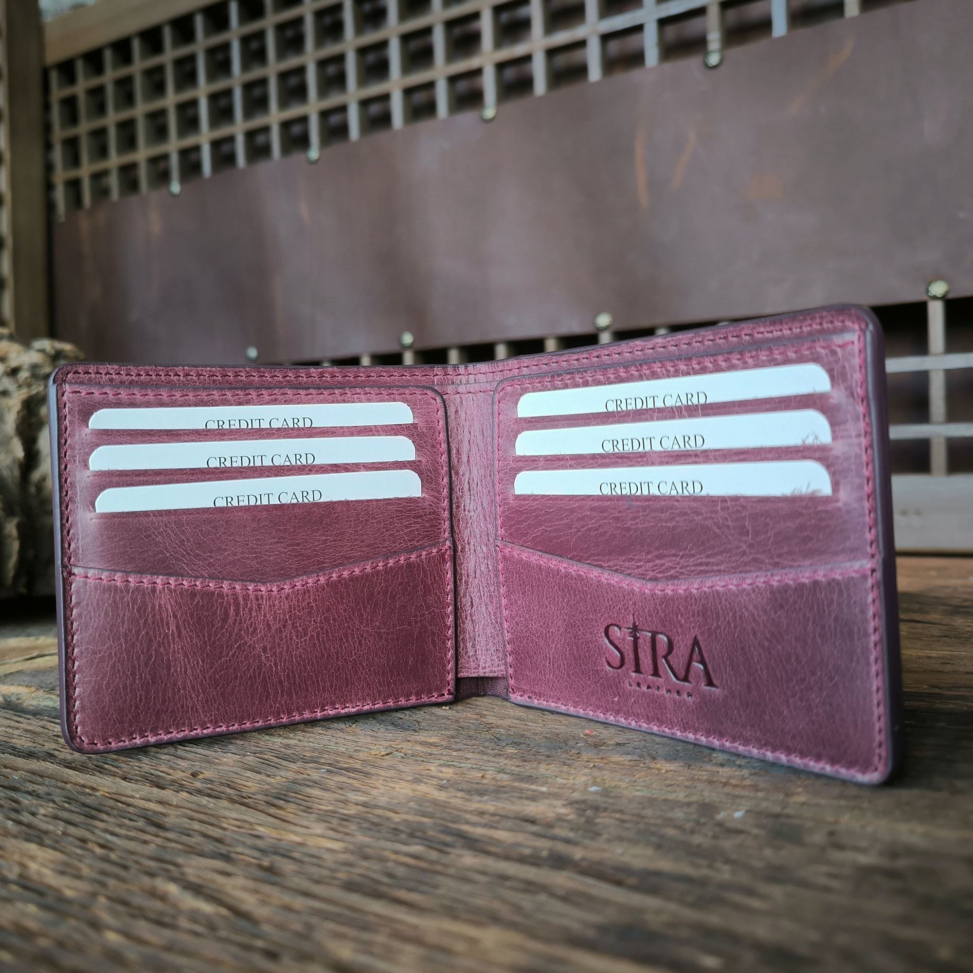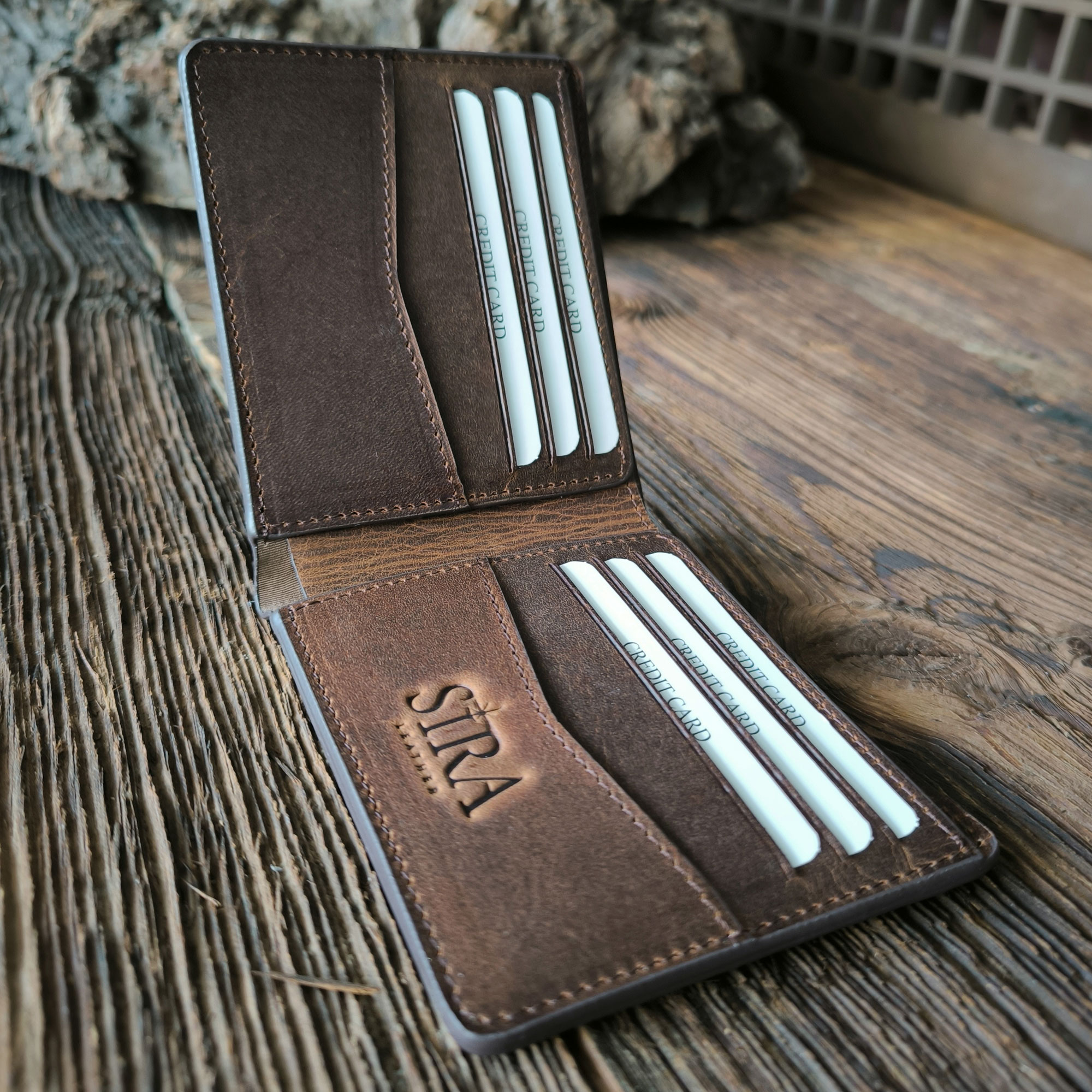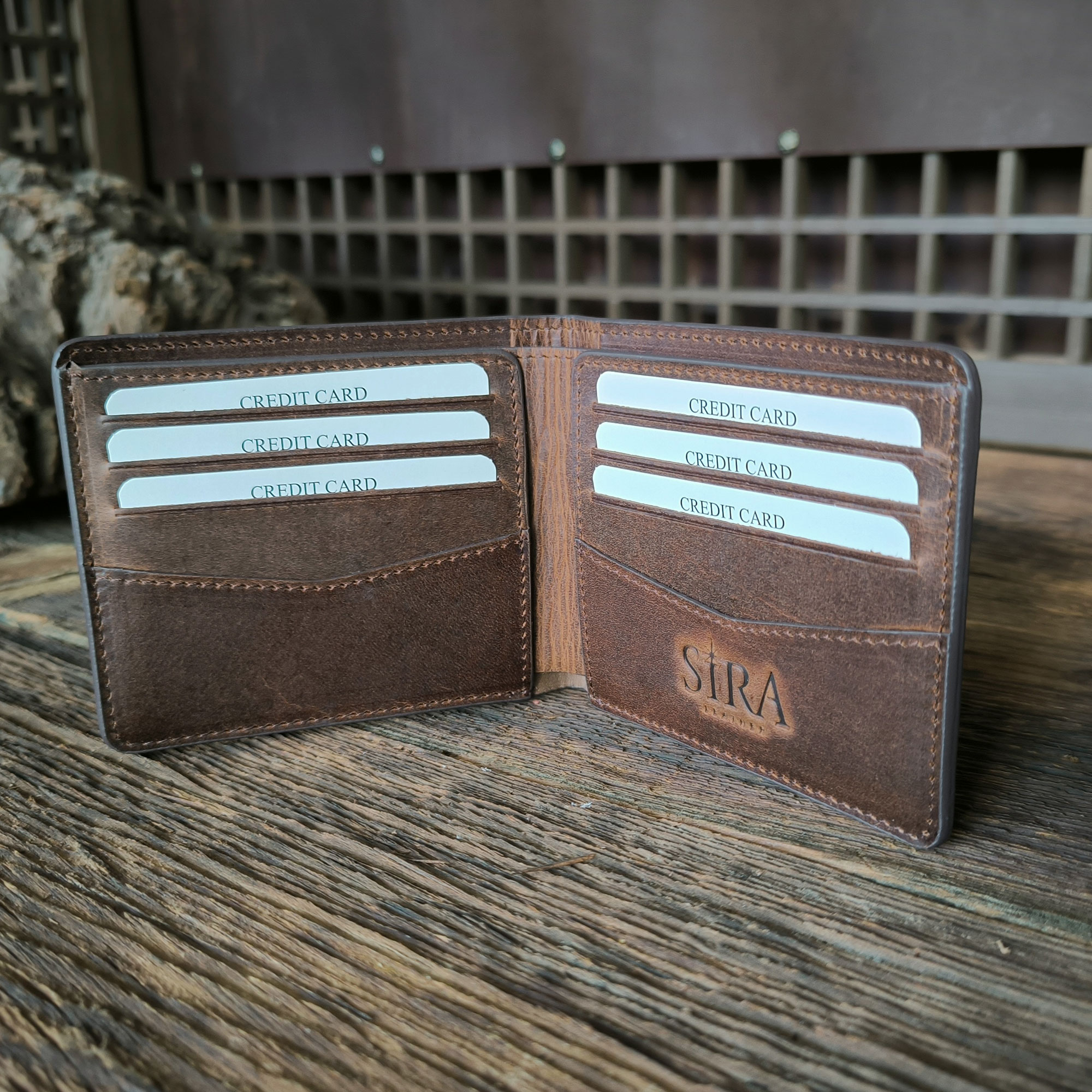 - Handcrafted Crazy Horse leather wallet.